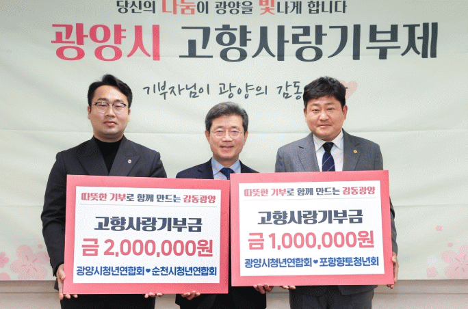 ±¤¾ç½Ãû³â¿¬ÇÕȸ´Â ÀڸŰῬ û³â´Üüµé°ú °íÇâ»ç¶û »óÈ£±âºÎÀÇ ÃëÁö¸¦ °øÀ¯ÇÏ¸ç »óÈ£±âºÎ¸¦ ÃßÁøÇßÀ¸¸ç, Æ÷Ç×ÇâÅäû³âȸ¿Í 100¸¸ ¿ø, ¼øÃµ½Ãû³â¿¬ÇÕȸ¿Í 200¸¸ ¿øÀ» »óÈ£ ±âºÎÇØ ÃÑ 300¸¸ ¿øÀ» ±âŹÇß´Ù.