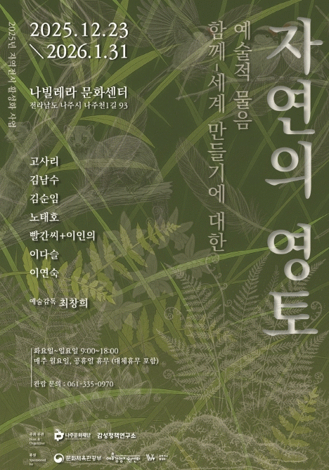 17ÀÏ ³ªÁÖ¹®ÈÀç´Ü(ÀÌ»çÀå À±º´ÅÂ)¿¡ µû¸£¸é ¹®ÈüÀ°°ü±¤ºÎ¿Í ¿¹¼ú°æ¿µÁö¿ø¼¾ÅͰ¡ ÁÖ°üÇÑ ¡®2025³â Áö¿ªÀü½Ã Ȱ¼ºÈ »ç¾÷ À¯Çü3 ¹Ì¼úÄÜÅÙÃ÷-Àü½Ã°ø°£ ¸ÅĪ Áö¿ø¡¯ °ø¸ð¿¡ ¼±Á¤µÅ Àü½Ã ¡®ÀÚ¿¬ÀÇ ¿µÅä ÇÔ²²-¼¼°è¸¸µé±â¿¡ ´ëÇÑ ¿¹¼úÀû ¹°À½¡¯À» ¿À´Â 12¿ù 23ÀϺÎÅÍ 2026³â 1¿ù 31ÀϱîÁö ³ªºô·¹¶ó¹®È¼¾ÅÍ¿¡¼ °³ÃÖÇÑ´Ù.