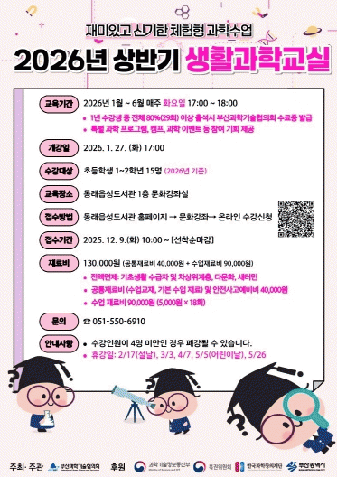[´º½ºÅë °û¸íÈÆ ±âÀÚ]ºÎ»ê µ¿·¡±¸´Â 2026³â 1¿ùºÎÅÍ µ¿·¡À¾¼ºµµ¼°ü°ú ¾È¶ô´©¸®µµ¼°ü, ¿Âºû¾î¸°ÀÌ ÀÛÀºµµ¼°ü¿¡¼ ºÎ»ê°úÇбâ¼úÇùÀÇȸ¿Í ¿¬°èÇØ °ü³» ÃʵîÇлýÀ» ´ë»óÀ¸·Î ¡®»ýȰ°úÇб³½Ç'À» ¿î¿µÇÑ´Ù°í ¹àÇû´Ù.