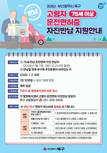 ºÎ»ê ºÏ±¸, ¡®75¼¼ ÀÌ»ó °í·ÉÀÚ ¿îÀü¸éÇãÁõ ÀÚÁø¹Ý³³ Áö¿ø»ç¾÷¡® ³»³â 1¿ùºÎÅÍ º»°Ý ½ÃÇà