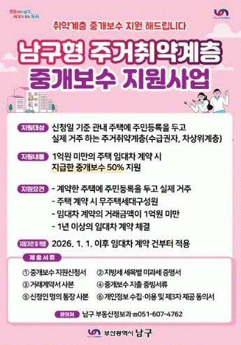 [´º½ºÅë °û¸íÈÆ ±âÀÚ]ºÎ»ê ³²±¸´Â °ü³» °ÅÁÖÇÏ´Â ÁÖ°Å Ãë¾à°èÃþÀÇ °æÁ¦Àû ºÎ´ãÀ» ¿ÏÈÇÏ°í ¾ÈÁ¤ÀûÀÎ ÁÖ°Åȯ°æÀ» Á¶¼ºÀ» À§ÇØ ¿À´Â 2026³â 1¿ùºÎÅÍ ¡®ÁÖ°Å Ãë¾à°èÃþ Áß°³º¸¼ö Áö¿ø»ç¾÷¡¯À» ½ÃÇàÇÑ´Ù°í ¹àÇû´Ù.