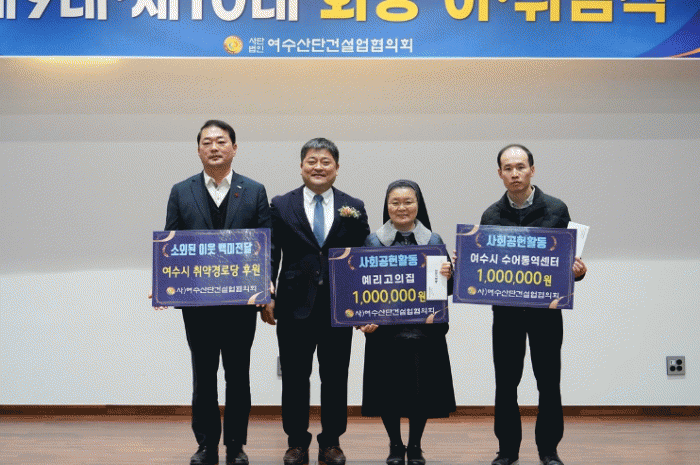 (»ç)¿©¼ö»ê´Ü°Ç¼³¾÷ÇùÀÇȸ(ȸÀå Á¤¼ºÈ£)°¡ Áö³ 22ÀÏ Á¦9¡¤10´ë ȸÀå ÀÌÃëÀӽĿ¡¼ °ü³» Ãë¾à º¹Áö½Ã¼³À» À§ÇØ ÈÄ¿ø±Ý°ú ¹é¹Ì µî 1õ 7¹é¿©¸¸ ¿ø »ó´çÀÇ ÈÄ¿ø±ÝǰÀ» Àü´ÞÇß´Ù.