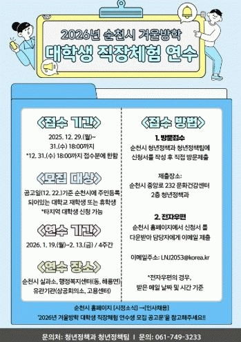 [´º½ºÅë ÃÖ¿ë¼ö ±âÀÚ]¼øÃµ½Ã´Â °Ü¿ï¹æÇÐÀ» ¸Â¾Æ ´ëÇлýµé¿¡°Ô ÇàÁ¤ ÇöÀå °æÇèÀÇ ±âȸ¸¦ Á¦°øÇϱâ À§ÇØ ¡®2026³â °Ü¿ï¹æÇÐ ´ëÇлý Á÷ÀåüÇè ¿¬¼ö»ý¡¯À» ¸ðÁýÇÑ´Ù°í ¹àÇû´Ù.