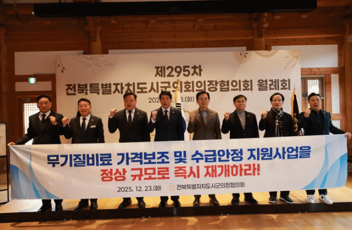 [´º½ºÅë ±è±¤¿ ±âÀÚ]12¿ù 23ÀÏ, ¹«ÁÖ Å±ǵµ¿ø¿¡¼ ¿¸° Á¦295Â÷ ÀüºÏƯº°ÀÚÄ¡µµ ½Ã±ºÀÇȸÀÇÀåÇùÀÇȸ(ȸÀå ³²°ü¿ì ÀüÁÖ½ÃÀÇȸ ÀÇÀå) ¿ù·Êȸ¿¡¼ ¼øÃ¢±ºÀÇȸ ¼ÕÁ¾¼® ÀÇÀåÀÌ °ÇÀÇÇÑ '¹«±âÁúºñ·á °¡°Ýº¸Á¶ ¹× ¼ö±Þ¾ÈÁ¤ Áö¿ø»ç¾÷ÀÇ Àç°³ Ã˱¸ °ÇÀǾÈ'À» äÅÃÇß´Ù.
