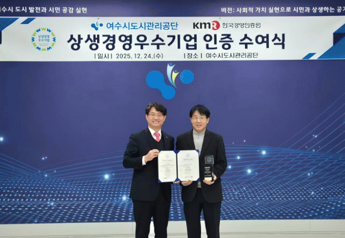 [´º½ºÅë ±è±¤¿ ±âÀÚ]¿©¼ö½Ãµµ½Ã°ü¸®°ø´ÜÀº »ó»ý°æ¿µ ½Çõ ¼º°ú¸¦ ÀÎÁ¤¹Þ¾Æ Çѱ¹°æ¿µÀÎÁõ¿øÀ¸·ÎºÎÅÍ ¡®»ó»ý°æ¿µ ¿ì¼ö±â¾÷¡¯ ÀÎÁõÀ» 2³â ¿¬¼Ó ȹµæÇß´Ù°í 24ÀÏ ¹àÇû´Ù.