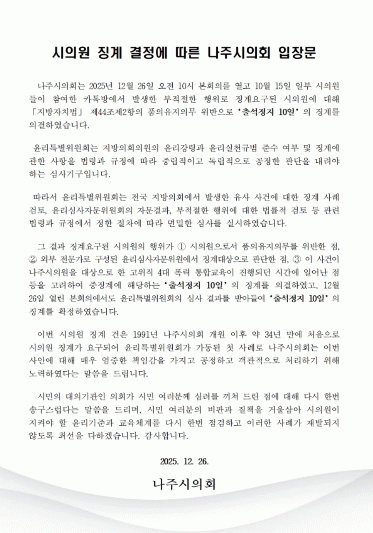[´º½ºÅë ÃÖ¿ë¼ö ±âÀÚ]³ªÁÖ½ÃÀÇȸ´Â 2025³â 12¿ù 26ÀÏ ¿ÀÀü 10½Ã º»È¸ÀǸ¦ ¿°í, 10¿ù 15ÀÏ ÀϺΠ½ÃÀÇ¿øµéÀÌ Âü¿©ÇÑ Ä«Å广¿¡¼ ¹ß»ýÇÑ ºÎÀûÀýÇÑ ÇàÀ§·Î ¡°è¿ä±¸µÈ ½ÃÀÇ¿ø¿¡ ´ëÇØ 'Áö¹æÀÚÄ¡¹ý' Á¦44Á¶Á¦2Ç×ÀÇ Ç°ÀÇÀ¯ÁöÀǹ« À§¹ÝÀ¸·Î ¡®Ãâ¼®Á¤Áö 10ÀÏ¡¯ÀÇ Â¡°è¸¦ ÀǰáÇϰí ÀÔÀå¹®À» ¹ßÇ¥Çß´Ù.