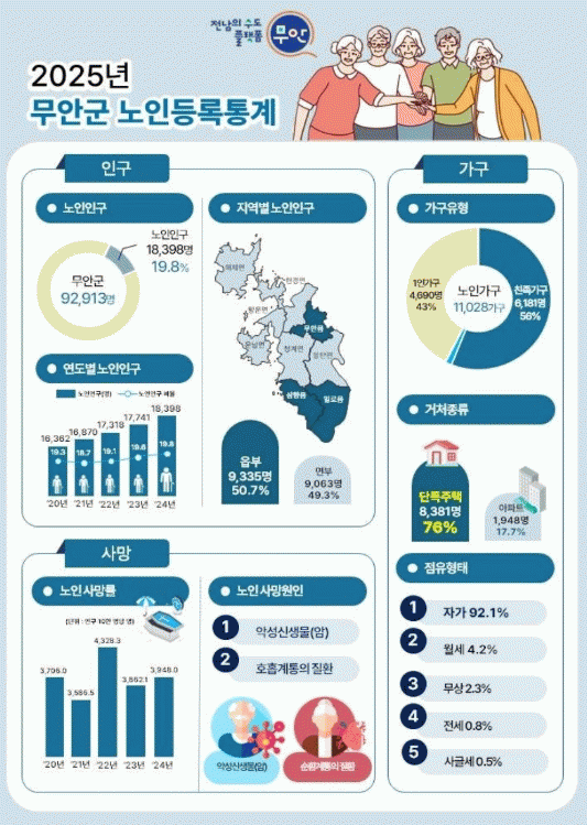 °øÇ¥ °á°ú, 2024³â ¸» ±âÁØ ¹«¾È±º ³ëÀÎ Àα¸´Â 18,398¸íÀ¸·Î Àüü Àα¸ 92,913¸í °¡¿îµ¥ 19.8%¸¦ Â÷ÁöÇÑ´Ù.