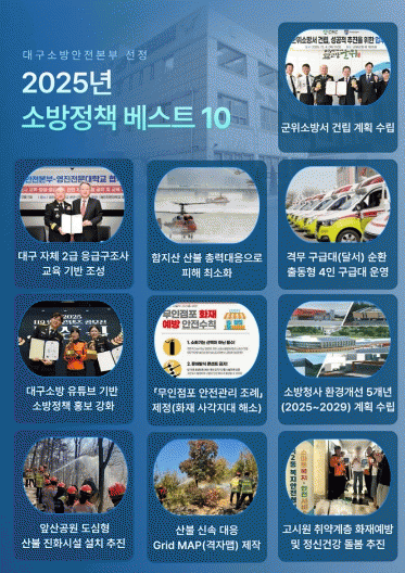 [´º½ºÅë ¾È»óµ· ±âÀÚ] ´ë±¸¼Ò¹æ¾ÈÀüº»ºÎ´Â 2025³â ÇÑ ÇØ µ¿¾È ÃßÁøÇÑ ÁÖ¿ä ¼Ò¹æÁ¤Ã¥ °¡¿îµ¥ ÇöÀå ´ëÀÀ·Â °È¿Í ½Ã¹Î ¾ÈÀü ÁõÁø¿¡ ±â¿©ÇÑ ¡®2025 ´ë±¸¼Ò¹æ ¼Ò¹æÁ¤Ã¥ º£½ºÆ® 10¡¯À» ¼±Á¤ÇØ ¹ßÇ¥Çß´Ù.