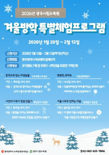 [´º½ºÅë ±è±¤¿ ±âÀÚ]±¤ÁÖ±¤¿ª½Ã ½Ã¸³¼ö¸ñ¿øÀº ¾î¸°À̸¦ À§ÇÑ ¡®2026³â °Ü¿ï¹æÇРüÇè ÇÁ·Î±×·¥¡¯ Âü°¡ÀÚ 640¸íÀ» ¿À´Â 13ÀÏ ¿ÀÀü 10½ÃºÎÅÍ ¼±Âø¼ø ¸ðÁýÇÑ´Ù.