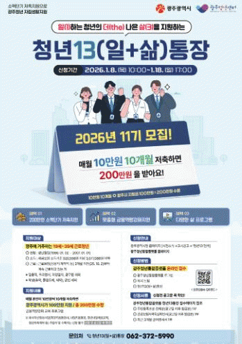 ±¤ÁÖ±¤¿ª½Ã, ¡®Ã»³â13(ÀÏ+»î)ÅëÀ塯 620¸í ¸ðÁý...¿ù 10¸¸¿ø¾¿ 100¸¸¿ø ÀúÃàÇϸé 100¸¸¿ø Áö¿ø