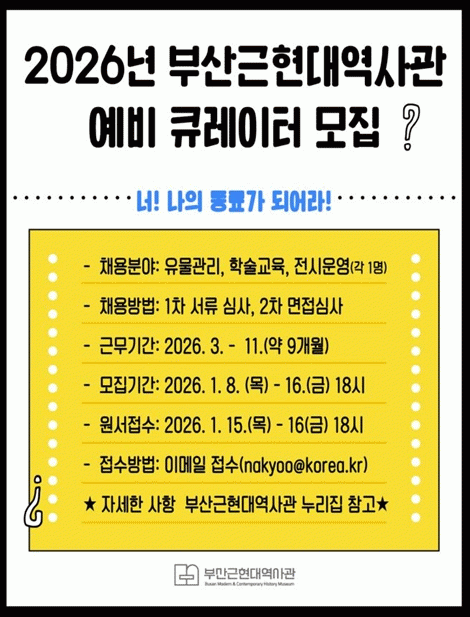 [´º½ºÅë °û¸íÈÆ ±âÀÚ]ºÎ»ê±ÙÇö´ë¿ª»ç°üÀº ¹Ú¹°°ü Çп¹ ºÐ¾ß Àü¹®Àη ¾ç¼º°ú û³â ÀÏÀÚ¸® âÃâÀ» À§ÇØ ¿À´Ã(8ÀÏ)ºÎÅÍ 1¿ù 16ÀϱîÁö '2026³â ºÎ»ê±ÙÇö´ë¿ª»ç°ü ¿¹ºñ Å¥·¹ÀÌÅÍ(±â°£Á¦±Ù·ÎÀÚ)'¸¦ °ø°³ ¸ðÁýÇÑ´Ù°í ¹àÇû´Ù.