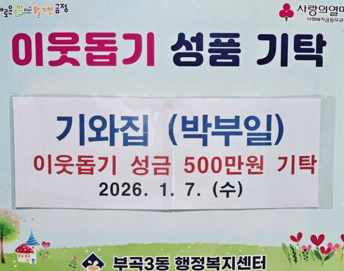 [´º½ºÅë °û¸íÈÆ ±âÀÚ]ºÎ»ê½Ã ±ÝÁ¤±¸ ºÎ°î3µ¿Àº Áö³ 7ÀÏ ¿À·ûµ¿ ±â¿ÍÁý¿¡¼ ¾î·Á¿î ÀÌ¿ôÀ» À§ÇØ ¼º±Ý 500¸¸¿øÀ» ±âŹÇß´Ù°í ¹àÇû´Ù.