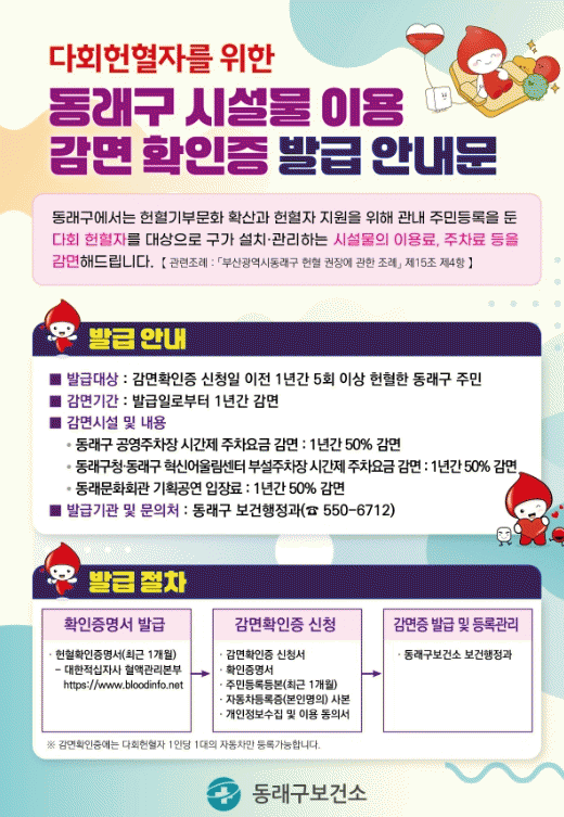 °¨¸é È®ÀÎÁõ ¼ÒÁöÀÚ´Â ¹ß±ÞÀϷκÎÅÍ 1³â°£ µ¿·¡±¸ °ø¿µÁÖÂ÷Àå, µ¿·¡±¸Ã», Çõ½Å¾î¿ï¸²¼¾ÅÍ ºÎ¼³ÁÖÂ÷Àå ½Ã°£Á¦ ÁÖÂ÷ ¿ä±ÝÀÇ 50%¸¦ °¨¸é¹ÞÀ» ¼ö ÀÖÀ¸¸ç, µ¿·¡¹®Èȸ°ü ±âȹ°ø¿¬ ÀÔÀå·áÀÇ 50%¸¦ °¨¸é¹Þ´Â´Ù.