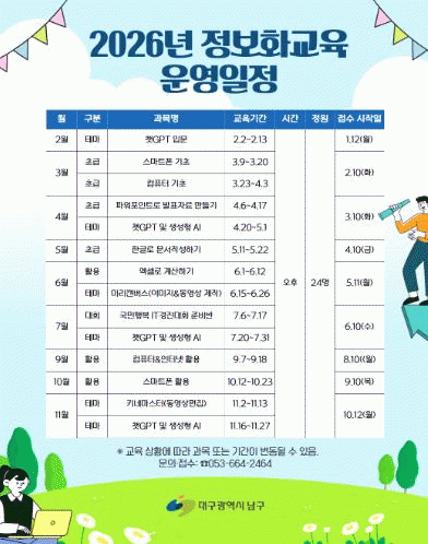 ´ë±¸ ³²±¸´Â 2026³â ±¸¹Î ´ë»ó Á¤º¸È±³À°À» ¿î¿µÇÑ´Ù. 2¿ù~11¿ù±îÁö 9°³¿ù°£ ÄÄÇ»ÅÍ, ½º¸¶Æ®Æù µî ´Ù¾çÇÑ ±³À°À» ½ÃÇàÇÏ¸ç ¹®ÀÇ »çÇ×Àº ³²±¸Ã»(¢Ï664-2464)À¸·Î ¹®ÀÇÇÏ¸é µÈ´Ù.