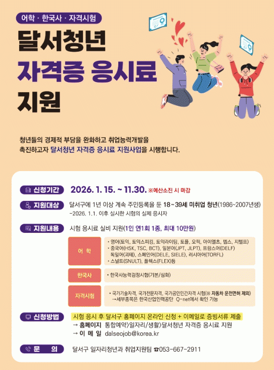 [´º½ºÅë ¾È»óµ· ±âÀÚ] ´ë±¸ ´Þ¼±¸´Â ¹ÌÃë¾÷ û³âÀÇ °æÁ¦Àû ºÎ´ãÀ» ¿ÏÈÇϰí Ãë¾÷ ¿ª·® °È¸¦ Áö¿øÇϱâ À§ÇØ ¡®2026³â ´Þ¼Ã»³â ÀÚ°ÝÁõ ÀÀ½Ã·á Áö¿ø»ç¾÷¡¯À» ÃßÁøÇϰí, 1¿ù 15ÀϺÎÅÍ ½Åû Á¢¼ö¸¦ ½ÃÀÛÇÑ´Ù.