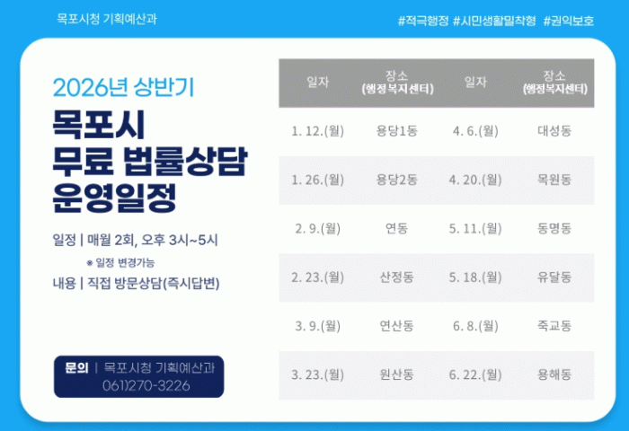 [´º½ºÅë ÃÖ¿ë¼ö ±âÀÚ]¸ñÆ÷½Ã´Â ½Ã¹ÎÀÇ ¹ý·ü Á¢±Ù¼ºÀ» ³ôÀÌ°í »ýȰ ¼Ó ¹ý·ü ¹®Á¦ ÇØ°áÀ» Áö¿øÇϱâ À§ÇØ Ã£¾Æ°¡´Â ¡®¹«·á ¹ý·ü»ó´ã¡¯À» ¿ÃÇØµµ Áö¼ÓÀûÀ¸·Î ¿î¿µÇÑ´Ù.