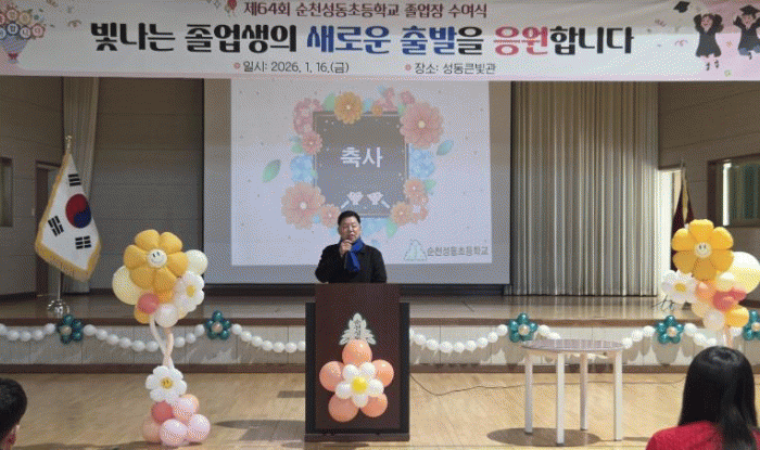 [´º½ºÅë ÃÖ¿ë¼ö ±âÀÚ]±èÁ¤Èñ Àü³²µµÀÇȸ ±³À°À§¿øÀåÀº 1¿ù 16ÀÏ, ¼øÃµ¼ºµ¿ÃʵîÇб³(±³Àå ¿Àȼ±)¿¡¼ ¿¸° Á¦64ȸ Á¹¾÷½Ä¿¡ Âü¼®ÇØ Á¹¾÷»ýµéÀÇ »õ·Î¿î Ãâ¹ßÀ» ÃàÇÏÇÏ°í µû¶æÇÑ °Ý·ÁÀÇ ¸Þ½ÃÁö¸¦ ÀüÇß´Ù.