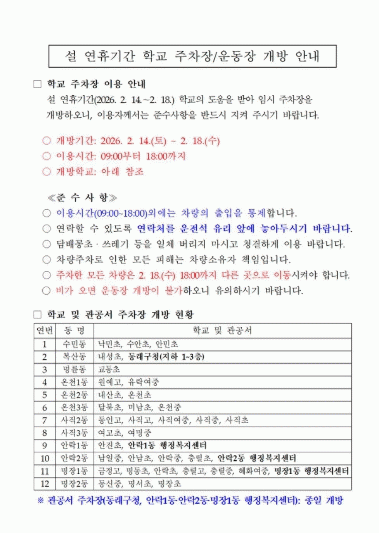 ¿¬ÈÞ ±â°£ µ¿¾È °ü°ø¼ ÁÖÂ÷ÀåÀº Á¾ÀÏ °³¹æµÇ¸ç, Çб³ ÁÖÂ÷ÀåÀº ¿ÀÀü 9½ÃºÎÅÍ ¿ÀÈÄ 6½Ã±îÁö ÀÌ¿ëÇÒ ¼ö ÀÖ´Ù. ´Ù¸¸, ¿ìõ ½Ã ¿îµ¿ÀåÀº °³¹æÇÏÁö ¾Ê´Â´Ù.