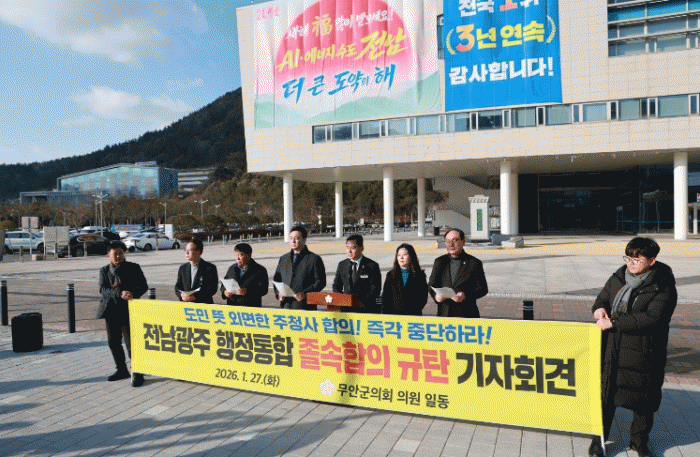 [´º½ºÅë ÃÖ¿ë¼ö ±âÀÚ]¹«¾È±ºÀÇȸ´Â 1¿ù 27ÀÏ Àü³²µµÃ» Àܵð±¤Àå¿¡¼ ±âÀÚȸ°ßÀ» ¿°í, À̳¯ ¹ßÇ¥µÈ Àü³²¡¤±¤ÁÖ ÇàÁ¤ÅëÇÕ °ü·Ã ÇÕÀÇ ³»¿ëÀ» µÎ°í ¡°±íÀº À¯°¨À» ³Ñ¾î °·ÂÇÑ ºÐ³ë¸¦ Ç¥ÇÑ´Ù¡±¸ç ±è¿µ·Ï Àü¶ó³²µµÁö»ç¸¦ Á¤¸éÀ¸·Î ±ÔźÇß´Ù.