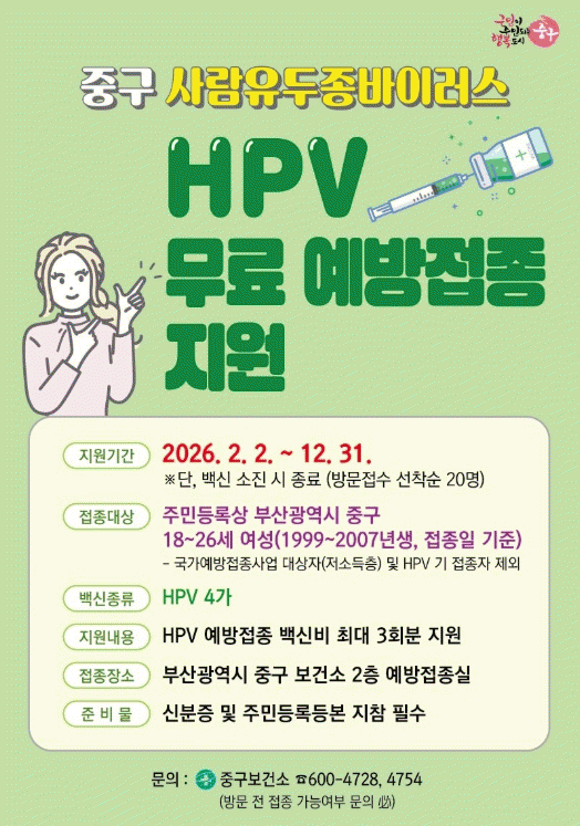 [´º½ºÅë °û¸íÈÆ ±âÀÚ]ºÎ»ê Áß±¸´Â HPV±¹°¡¿¹¹æÁ¢Á¾ ´ë»ó¿¡¼ Á¦¿ÜµÈ ¸¸18~26¼¼(1999³â~2007³â»ý) Áß±¸¹Î ¿©¼ºÀ» ´ë»óÀ¸·Î »ç¶÷À¯µÎÁ¾¹ÙÀÌ·¯½º ¿¹¹æÁ¢Á¾À» ÃÖ´ë 3ȸ Áö¿øÇÑ´Ù°í ¹àÇû´Ù.