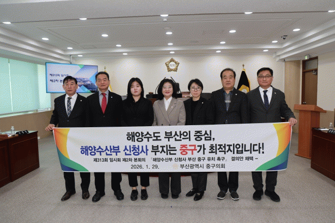 [´º½ºÅë °û¸íÈÆ ±âÀÚ] ºÎ»ê±¤¿ª½Ã Áß±¸ÀÇȸ´Â 1¿ù 29ÀÏ Á¦313ȸ ÀÓ½Ãȸ Á¦2Â÷ º»È¸ÀÇ¿¡¼ 'ÇØ¾ç¼ö»êºÎ ½Åû»ç ºÎ»ê Áß±¸ À¯Ä¡ Ã˱¸ °áÀǾÈ'À» °ÁÖÈñ ÀÇÀå µî ÀÇ¿ø 7ÀÎ Àü¿ø ¸¸ÀåÀÏÄ¡·Î äÅÃÇß´Ù°í ¹àÇû´Ù.