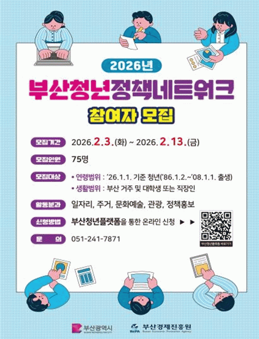 [´º½ºÅë °û¸íÈÆ ±âÀÚ] ºÎ»ê½Ã´Â û³âÀÇ ½ÃÁ¤ Âü¿© È®´ë¿Í û³â ÁÖµµÀÇ Á¤Ã¥ Çü¼ºÀ» À§ÇØ '2026³â ºÎ»êû³âÁ¤Ã¥³×Æ®¿öÅ©¿¡ Âü¿©ÇÒ Ã»³â 75¸íÀ» ¿À´Ã(3ÀÏ)ºÎÅÍ 2¿ù 13ÀϱîÁö °ø°³ ¸ðÁýÇÑ´Ù°í ¹àÇû´Ù.