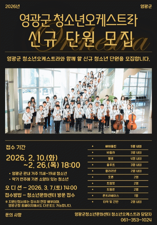 [´º½ºÅë ±è±¤¿ ±âÀÚ]¿µ±¤±ºÀº Áö¿ª û¼Ò³âµéÀÇ ¹®È¿¹¼ú ¿ª·® °È¿Í °ÇÀüÇÑ ¼ºÀåÀ» Áö¿øÇϱâ À§ÇØ ¡®2026³â ¿µ±¤±º û¼Ò³â¿ÀÄɽºÆ®¶ó ½Å±Ô ´Ü¿ø¡¯À» ¸ðÁýÇÑ´Ù°í ¹àÇû´Ù.