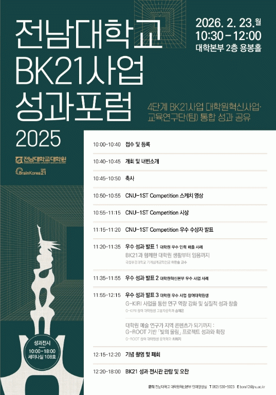 Àü³²´ëÇб³ ´ëÇпøÀº À̹ø Æ÷·³¿¡¼ µµÃâµÈ ¼º°ú ºÐ¼® ¹× ȯ·ù °á°ú¸¦ Åä´ë·Î 2026³âµµ ¿¬±¸ Áö¿ø ·Îµå¸ÊÀ» °íµµÈÇÒ °èȹÀÌ´Ù. ƯÈ÷ 2027³âºÎÅÍ »õ·Ó°Ô ÃßÁøµÉ ¡®5´Ü°è BK21 »ç¾÷¡¯¿¡ ¼±Á¦ÀûÀ¸·Î ´ëÀÀÇÏ¸ç ¿¬±¸ °æÀï·Â °È ±â¹ÝÀ» ü°èÀûÀ¸·Î ±¸ÃàÇØ ³ª°¥ ¹æÄ§ÀÌ´Ù.