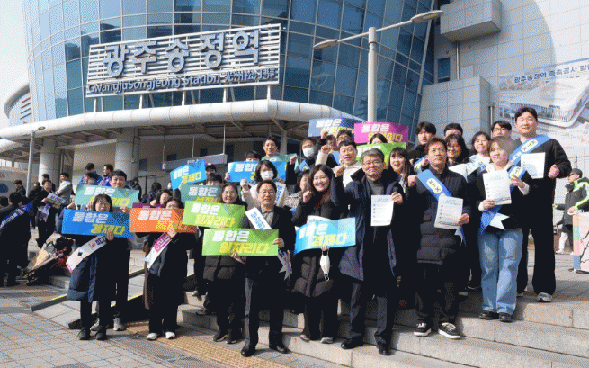 °±âÁ¤ ±¤ÁÖ±¤¿ª½ÃÀåÀÌ Áö³ 14ÀÏ ¼³ ¸íÀýÀ» ¾ÕµÎ°í °íÇâÀ» ãÀº ±Í¼º°´µé¿¡°Ô È£³²¼± KTXÁõÆí°ú ±¤ÁÖÀü³² ÅëÇÕÀ» È«º¸ÇÑ µÚ °øÁ÷ÀÚµé°ú ±â³äÃÔ¿µÀ» Çϰí ÀÖ´Ù. /±¤ÁÖ±¤¿ª½Ã Á¦°ø