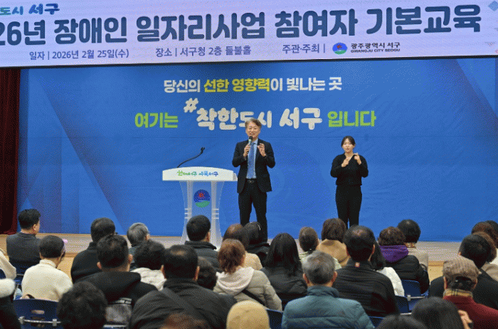 [´º½ºÅë ±è±¤¿ ±âÀÚ]±¤ÁÖ±¤¿ª½Ã ¼±¸°¡ Àå¾ÖÀÎÀÇ »çȸÂü¿© È®´ë¿Í ÀÚ¸³±â¹Ý °È¸¦ À§ÇÑ ¡®2026³â Àå¾ÖÀÎÀÏÀÚ¸®»ç¾÷¡¯À» ÃßÁøÇÑ´Ù. ¼±¸´Â 25ÀÏ ¼±¸Ã» µéºÒȦ¿¡¼ Àå¾ÖÀÎÀÏÀÚ¸®»ç¾÷ Âü¿©ÀÚ 160¿© ¸íÀ» ´ë»óÀ¸·Î ¾ÈÀüº¸°Ç ¹× Á÷¹« ¼Ò¾ç ±³À°À» ½Ç½ÃÇß´Ù. À̹ø ±³À°Àº Âü¿©ÀÚµéÀÇ Á÷¹« ÀÌÇØµµ¸¦ ³ôÀÌ°í »ê¾÷ÀçÇØ¸¦ ¿¹¹æÇϱâ À§ÇØ ¸¶·ÃµÆ´Ù.