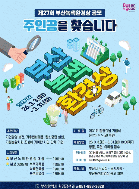 [´º½ºÅë °û¸íÈÆ ±âÀÚ] ºÎ»ê½Ã´Â Àúź¼Ò ±×¸°µµ½Ã Á¶¼º¿¡ ¾ÕÀå¼°í Áö¿ª ȯ°æº¸Àü°ú ȯ°æºÐ¾ß ¹ßÀü¿¡ ±â¿©ÇÑ 'ºÎ»ê³ì»öȯ°æ»ó' Èĺ¸ÀÚ¸¦ ¿À´Ã(3ÀÏ)ºÎÅÍ ¿À´Â 3¿ù 31ÀϱîÁö Ãßõ¹Þ´Â´Ù°í ¹àÇû´Ù.