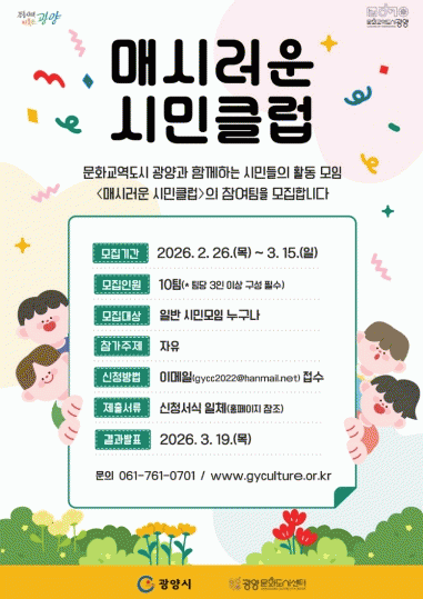 [´º½ºÅë ±è±¤¿ ±âÀÚ]±¤¾ç¹®Èµµ½Ã¼¾ÅÍ´Â ½Ã¹ÎÀÇ ÀÚ¹ßÀûÀÎ ¹®ÈȰµ¿À» Áö¿øÇϱâ À§ÇØ 2026³â »ó¹Ý±â Ȱµ¿À» ÇÔ²²ÇÒ '¸Å½Ã·¯¿î ½Ã¹ÎŬ·´' 7±âÀÇ Âü¿©ÆÀÀ» ¸ðÁýÇÑ´Ù.