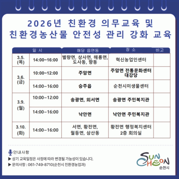 [´º½ºÅë ±è±¤¿ ±âÀÚ]¼øÃµ½Ã´Â ¿À´Â 5ÀϺÎÅÍ 10ÀϱîÁö ÃÑ 6ȸ¿¡ °ÉÃÄ Çõ½Å³ó¾÷Àμ¾ÅÍ¿Í ÇàÁ¤º¹Áö¼¾ÅÍ µî¿¡¼ ģȯ°æ ³ó»ê¹°À» »ý»êÇÏ´Â ³ó¾÷ÀÎ 1,200¿© ¸íÀ» ´ë»óÀ¸·Î ¡®Ä£È¯°æ³ó¾÷ Àǹ«±³À° ¹× ģȯ°æ³ó»ê¹° ¾ÈÀü¼º °ü¸® °È ±³À°¡¯À» ½Ç½ÃÇÑ´Ù°í ¹àÇû´Ù.