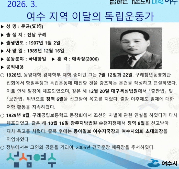¿©¼ö½Ã, 2026³â 3¿ùÀÇ µ¶¸³¿îµ¿°¡ ¡®¹®±Õ(Ùþг)¡¯ ¼±»ý ¼±Á¤