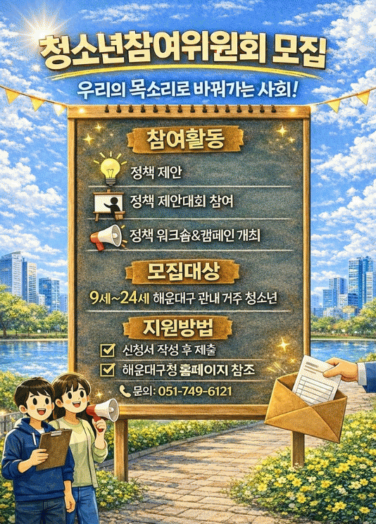 Áö¿ø ¹æ¹ýÀº ÇØ¿î´ë±¸ ȨÆäÀÌÁö¿¡ °Ô½ÃµÈ ¡®2026³â ÇØ¿î´ë±¸ û¼Ò³â Âü¿©À§¿øÈ¸ À§¿ø ¸ðÁý °ø°í¹®¡¯À» Âü°íÇØ ÀüÀÚ¿ìÆíÀ¸·Î ½ÅûÇϰųª, ¹®Èº¹ÇÕ¼¾ÅÍ(¼¾ÅÒÁß¾Ó·Î 170) 4Ãþ¿¡ À§Ä¡ÇÑ °¡Á·º¹Áö°ú¿¡ ¹æ¹®ÇØ ½Åû¼·ù¸¦ Á¦ÃâÇÏ¸é µÈ´Ù.