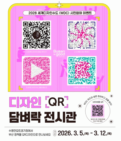 [´º½ºÅë °û¸íÈÆ ±âÀÚ]ºÎ»ê½Ã´Â ´õ ¸¹Àº ½Ã¹ÎÀÇ Âü¿©¿Í °ø°¨À» ¹ÙÅÁÀ¸·Î '2028 ¼¼°èµðÀÚÀμöµµ ºÎ»ê(WDC)' µµ½Ãºê·£µå¸¦ ¾Ë¸®±â À§ÇØ ¼ö¿µ¸¸¿äÆ®°æ±âÀå °¡¼³¿ïŸ¸®¸¦ Ȱ¿ëÇÑ '¼¼°èµðÀÚÀμöµµ(WDC) µî ½ÃÁ¤ ÁÖ¿äÁ¤Ã¥ È«º¸ µðÀÚÀÎ Àü½Ã¹°'À» Á¦ÀÛÇϰí, 'Á¤Ã¥ Âü¿©Çü Å¥¾Ë(QR) À̺¥Æ®'¸¦ ÁøÇàÇÑ´Ù°í ¹àÇû´Ù.