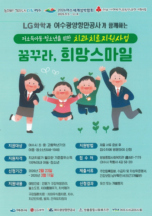 ¿©¼ö½Ã°¡ ¹Î¡¤°üÀÌ Çù·ÂÇØ Àú¼Òµæ ¾Æµ¿¡¤Ã»¼Ò³âÀÇ ±¸°°Ç° ÁõÁøÀ» À§ÇÑ Ä¡°úÄ¡·á Áö¿ø»ç¾÷ ¡¸2026 ²Þ²Ù¶ó, Èñ¸Á½º¸¶ÀÏ¡¹À» ÃßÁøÇÑ´Ù.