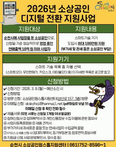 [´º½ºÅë ±è±¤¿ ±âÀÚ]¼øÃµ½Ã´Â ¿Â¶óÀÎ ÁÖ¹® È®´ë¿Í ºñ´ë¸é ¼Òºñ Áõ°¡ µî µðÁöÅРȯ°æ º¯È¿¡ ´ëÀÀÇØ Áö¿ª ¼Ò»ó°øÀÎÀÇ °æÀï·ÂÀ» ³ôÀ̱â À§ÇÑ ¡®2026³â ¼Ò»ó°øÀÎ µðÁöÅÐ Àüȯ Áö¿ø»ç¾÷¡¯À» º»°Ý ÃßÁøÇÑ´Ù.