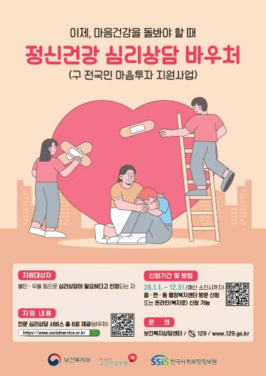 Áö¿ø ´ë»óÀÚ·Î ¼±Á¤µÇ¸é ÃÑ 8ȸ(ȸ´ç ÃÖ¼Ò 50ºÐ ÀÌ»ó) 1:1 ´ë¸é ½É¸®»ó´ã ¼ºñ½º¸¦ ¹ÞÀ» ¼ö ÀÖ´Â ¹Ù¿ìó°¡ Á¦°øµÇ¸ç, °ÅÁÖÁö¿Í »ó°ü¾øÀÌ ¼ºñ½º Á¦°ø ±â°üÀ» ¼±ÅÃÇÑ ÈÄ ¼Òµæ ¼öÁØ¿¡ µû¸¥ º»ÀÎ ºÎ´ã±Ý(0~50%)À» ³³ºÎÇϰí ÀÌ¿ëÇÒ ¼ö ÀÖ´Ù.