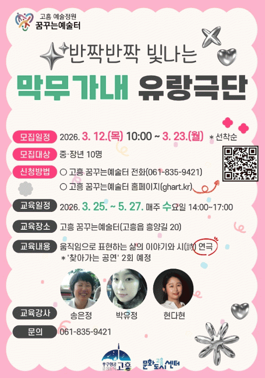Âü°¡ ½ÅûÀº 3¿ù 12ÀϺÎÅÍ °íÈï ²Þ²Ù´Â¿¹¼úÅÍ È¨ÆäÀÌÁö ¶Ç´Â ÀüÈ·Î ÇÒ ¼ö ÀÖÀ¸¸ç, °íÈﱺ¿¡ °ÅÁÖÇÏ´Â ÁßÀå³âÃþÀ̶ó¸é ´©±¸³ª Âü¿© °¡´ÉÇÏ´Ù.