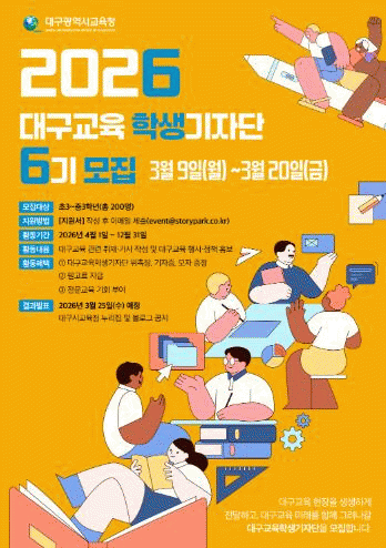 [´º½ºÅë ¾È»óµ· ±âÀÚ] ´ë±¸½Ã±³À°Ã»Àº 3¿ù 9ÀϺÎÅÍ 20ÀϱîÁö 2ÁÖ°£ ´ë±¸±³À°ÀÇ ÁÖ¿ä Á¤Ã¥°ú °¢Á¾ ¼Ò½ÄÀ» »ýµ¿°¨ ÀÖ°Ô ÀüÇÏ´Â ´ë±¸±³À°ÀÇ È«º¸´ë»ç ¿ªÇÒÀ» ÇÒ¡®2026³â ´ë±¸±³À°±âÀÚ´Ü¡¯À» ¸ðÁýÇÑ´Ù°í ¹àÇû´Ù.