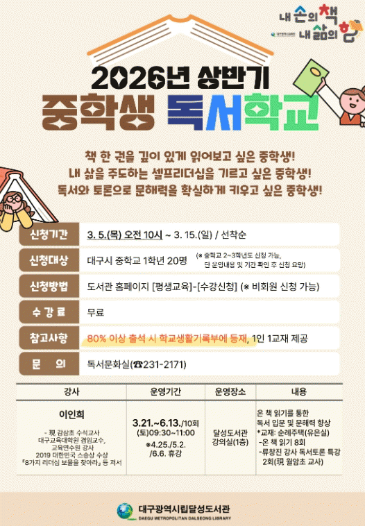 ¿ÂÃ¥ Àбâ¿Í Åä·Ð¡¤±Û¾²±â µî ´Ù¾çÇÑ µ¶ÈÄȰµ¿À» ÅëÇØ ¹®ÇØ·ÂÀ» Çâ»ó½Ãų ¼ö ÀÖµµ·Ï ¿î¿µµÇ¸ç, °ÀÇ´Â ´ë±¸½Ã±³À°Ã» µ¶¼Àι®±³À°Áö¿ø´Ü ¼Ò¼Ó ÀÌÀÎÈñ °¨»ïÃÊ ¼ö¼®±³»ç µî ÇöÁ÷ ±³»çµéÀÌ ÁøÇàÇÑ´Ù.