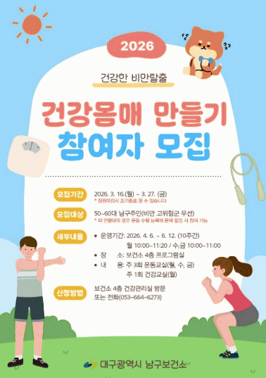 [´º½ºÅë ¾È»óµ· ±âÀÚ]´ë±¸ ³²±¸´Â ¿À´Â 4¿ùºÎÅÍ Áö¿ªÁÖ¹ÎÀÇ ½ÅüȰµ¿ ½Çõ Ȱ¼ºÈ¿Í ºñ¸¸ ¿¹¹æÀ» À§ÇÑ ¡®2026³â ºñ¸¸Å»Ãâ!°Ç°¸ö¸Å ¸¸µé±â ±³½Ç¡¯À» ¿î¿µÇÑ´Ù°í ¹àÇû´Ù.