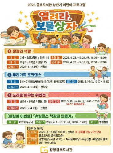 ÇÑÆí, 2026³â ±ÝÈ£µµ¼°ü »ó¹Ý±â ¾î¸°ÀÌ ÇÁ·Î±×·¥°ú °ü·ÃÇÑ ÀÚ¼¼ÇÑ »çÇ×Àº ±¤¾ç½Ã¸³µµ¼°ü ´©¸®Áý¿¡¼ È®ÀÎÇϰųª ±ÝÈ£µµ¼°üÀ¸·Î ¹®ÀÇÇÏ¸é ¾È³»¹ÞÀ» ¼ö ÀÖ´Ù.