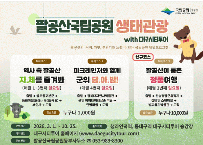 ¿ÃÇØ »õ·Ó°Ô ¼±º¸ÀÌ´Â ¡®ÆÈ°ø»êÀÌ Ç°Àº Á¤Ç° ¿©Ç࡯Àº ¸Å¿ù µÎ ¹øÂ° ÀÏ¿äÀÏ¿¡ ¿î¿µµÈ´Ù. ½Å¼þ°â À屺 À¯ÀûÁö¿¡¼ÀÇ ÀüÅë ±¹±Ã üÇèÀ» ½ÃÀÛÀ¸·Î, °«¹ÙÀ§ ¼Ò¿ø¸¶À» ³» °«¹ÙÀ§½Ä¹°¿ø¿¡¼ ÁøÇàµÇ´Â ¿¡ÄÚÆ¼¾î¸µ(ÀÚ¿¬ ¼Ó¿¡¼ »ýŸ¦ ŽÇèÇÏ¸ç ¹Ì¼ÇÀ» ¼öÇàÇϴ Ȱµ¿), ¹æÂ¥À¯±â¹Ú¹°°ü °ü¶÷ µî üÇè Ȱµ¿ À§ÁÖ·Î ±¸¼ºÇß´Ù. ÀÌ¿ë·á´Â 1¸¸ ¿øÀÌ´Ù.