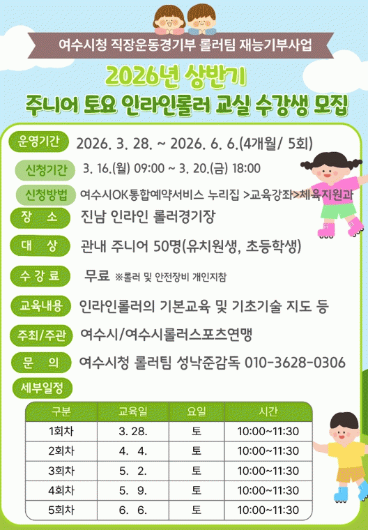 [´º½ºÅë ±è±¤¿ ±âÀÚ]¿©¼ö½Ã°¡ Áö¿ª À¯¼Ò³âÀ» ´ë»óÀ¸·Î ¡®2026³â »ó¹Ý±â ÁִϾî Åä¿ä ÀζóÀηѷ¯ ±³½Ç¡¯À» ¿î¿µÇÏ°í ¿À´Â 3¿ù 16ÀϺÎÅÍ 20ÀϱîÁö ¼ö°»ýÀ» ¼±Âø¼ø ¸ðÁýÇÑ´Ù.