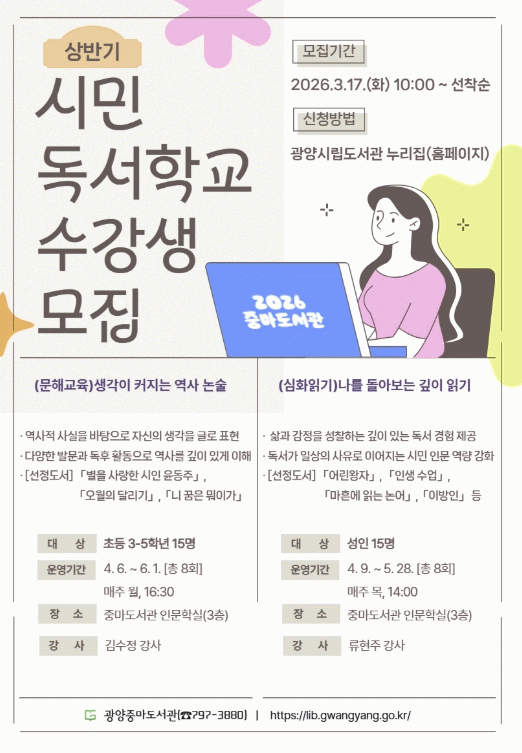 [´º½ºÅë ±è±¤¿ ±âÀÚ]±¤¾çÁ߸¶µµ¼°üÀÌ ½Ã¹ÎµéÀÇ Àι® µ¶¼ ¿ª·®À» ³ôÀÌ°í µ¶¼¸¦ ÅëÇØ »çÀ¯¿Í ¼ÒÅëÀÇ ±âȸ¸¦ Á¦°øÇϱâ À§ÇØ ¡®2026³â »ó¹Ý±â ½Ã¹Îµ¶¼Çб³¡¯ ÇÁ·Î±×·¥ ¼ö°»ýÀ» ¸ðÁýÇÑ´Ù.