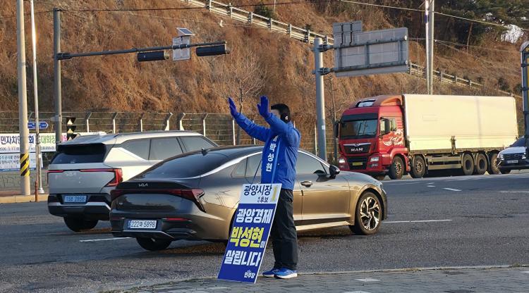 [´º½ºÅë - ±è±¤¿ ±âÀÚ ] ±¤¾ç½ÃÀå ¼±°Å¿¡ Ã⸶ÇÑ ¹ÎÁÖ´ç ¹Ú¼ºÇö ¿¹ºñÈ帴 13ÀÏ ¿ÀÀü 6½Ã 30²² ±¤¾ç½Ã ±ÝÈ£µ¿ ±ÝÈ£´ë±³ ÀÏ´ë¿Í ¿©¼ö±¤¾çÇ׸¸°ø»ç Á¤¹® ¾Õ¿¡¼ ¾ÆÄ§ Ãâ±Ù±æ¿¡ ³ª¼± ½Ã¹Îµé°ú Â÷·® ¿îÀüÀڵ鿡°Ô Àλ縦 Çϸç ÁöÁö¸¦ È£¼ÒÇϰí ÀÖ´Ù.