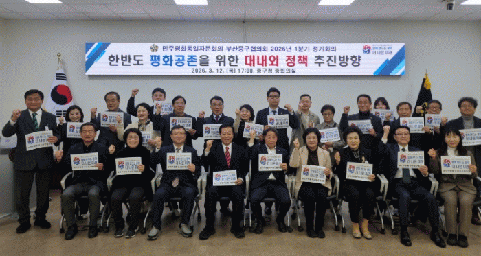[´º½ºÅë °û¸íÈÆ ±âÀÚ]¹ÎÁÖÆòÈÅëÀÏÀÚ¹®È¸ÀÇ ºÎ»êÁß±¸ÇùÀÇȸ(ÇùÀÇȸÀå ±èÇöÁø)´Â 3¿ù 12ÀÏ ¿ÀÈÄ 5½Ã Áß±¸Ã» ÁßȸÀǽǿ¡¼ Áß±¸Ã»Àå, ÀÚ¹®À§¿ø µî 30¿© ¸íÀÌ Âü¼®ÇÑ °¡¿îµ¥¡®Çѹݵµ ÆòȰøÁ¸À» À§ÇÑ ´ë³»¿Ü Á¤Ã¥ ÃßÁø¹æÇ⡯À» ÁÖÁ¦·Î¡®2026³â 1ºÐ±â Á¤±âȸÀÇ¡¯¸¦ °³ÃÖÇß´Ù.