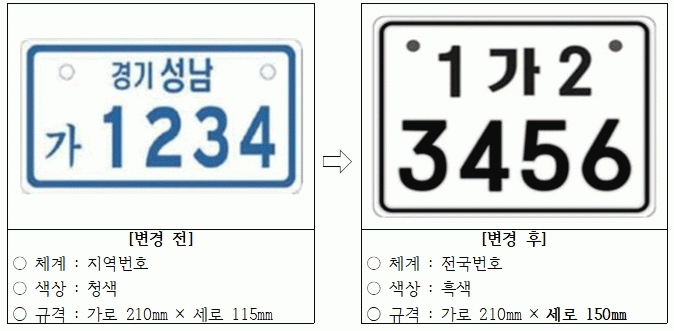 ÀÌ¿¡ µû¶ó ±âÁ¸ Áö¿ª¹øÈ£ ü°è´Â Àü±¹¹øÈ£ ü°è·Î ÀüȯÇϰí, ÀÌ·ûÀÚµ¿Â÷ ¹øÈ£ÆÇ ±Ô°ÝÀº ±âÁ¸ 21§¯¡¿11.5§¯(û»ö)¿¡¼ 21§¯¡¿15§¯(Èæ»ö)·Î È®´ëÇÑ´Ù. ¼¼·Î ±æÀ̰¡ 3.5§¯ ´Ã¾î³ª¸é¼ ¿ø°Å¸®¿¡¼µµ ¹øÈ£ ½Äº°ÀÌ º¸´Ù ½¬¿öÁú °ÍÀ¸·Î Àü¸ÁµÈ´Ù.